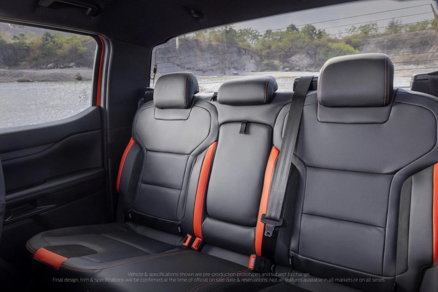 Nội thất Ford Ranger Raptor sử dụng cặp ghế thể thao hỗ trợ lưng người dùng cho hàng ghế trước, chỉ khâu đỏ tương phản, vô lăng bọc da tích hợp tính năng sưởi cùng lẫy chuyển số phía sau, đèn nền nội thất.