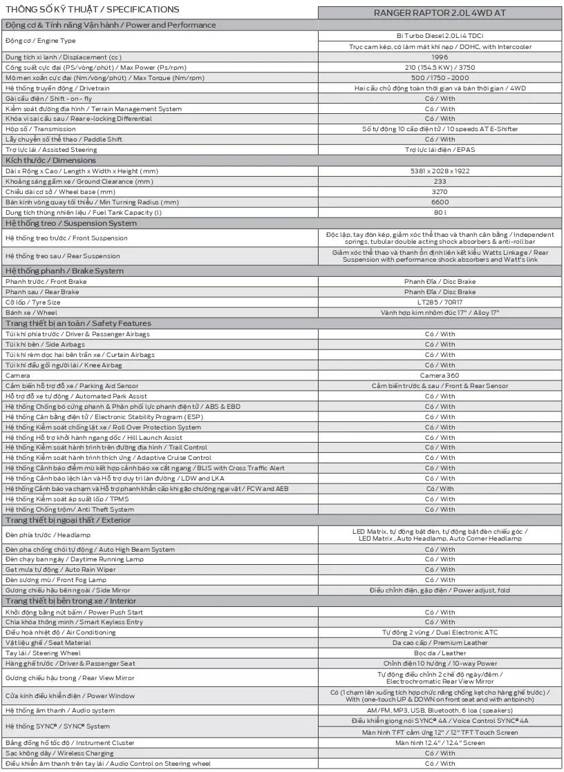Khá ngạc nhiên là tại các thị trường khác nhau, trang bị này cho thông số khác nhau chẳng hạn tại châu Âu, Ford Ranger Raptor chỉ có công suất 284 mã lực và 491 Nm trong khi tại Australia những thông số trên lần lượt là 392 mã lực và 583 Nm.